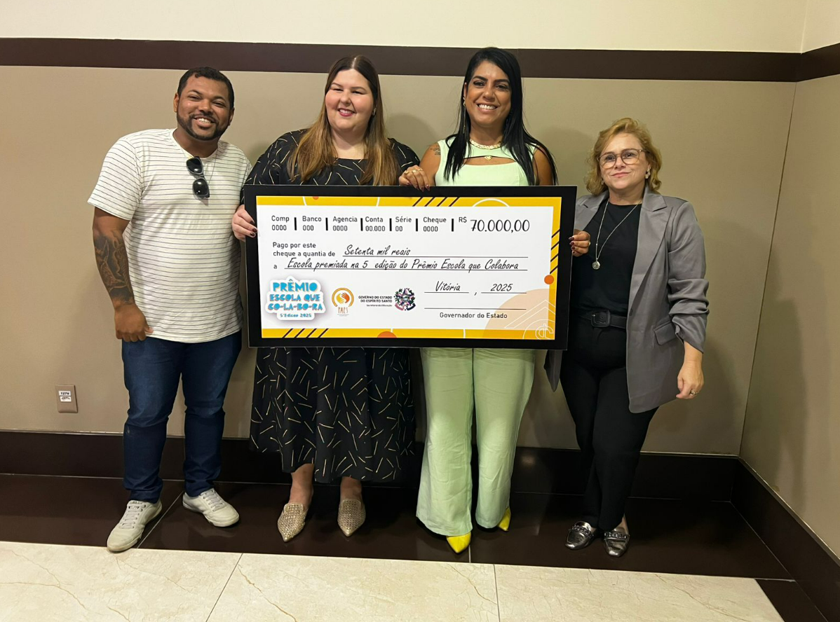 A escola recebeu R$ 70 mil, valor dividido em duas parcelas, como reconhecimento pelo desempenho de alunos e equipe pedagógica nos indicadores de aprendizagem. O Paebes, sigla para Programa de Avaliação da Educação Básica do Espírito Santo, mede o nível de proficiência dos estudantes da rede pública.