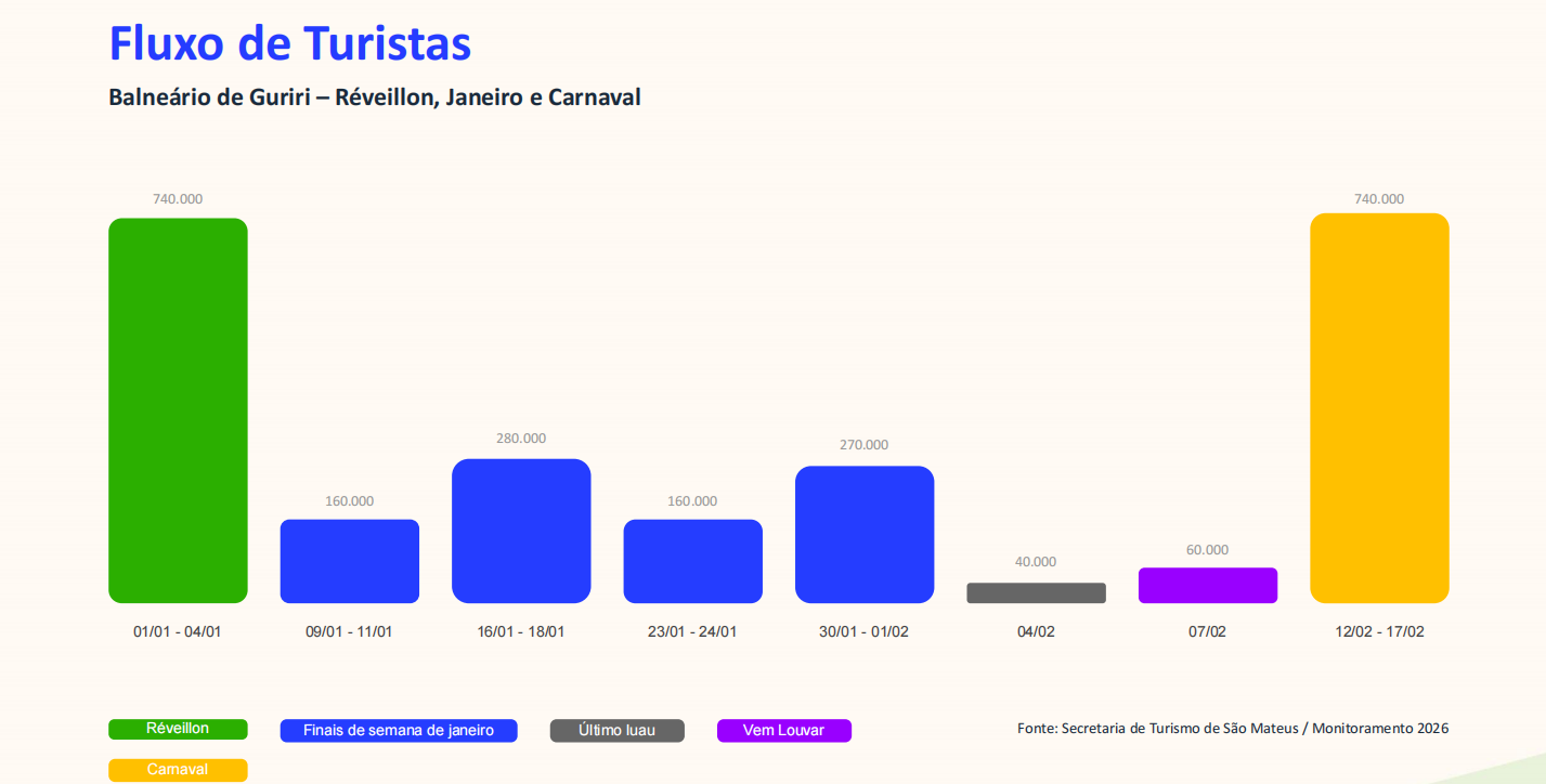 • Janeiro: Os finais de semana mantiveram uma média constante, com destaque para o período de 16 a 18 de janeiro, que recebeu 280 mil turistas.