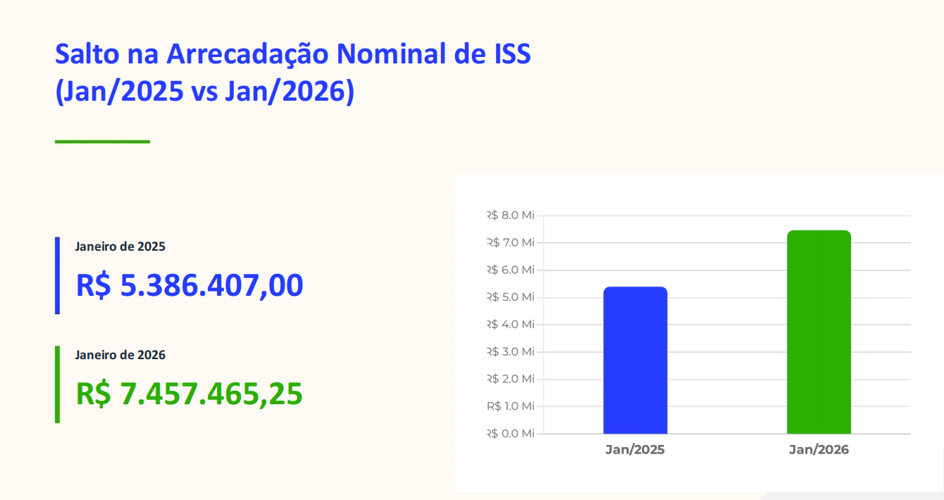 Em números absolutos, a arrecadação de janeiro saltou de R$ 5,38 milhões (2025) para R$ 7,45 milhões (2026), um incremento nominal superior a R$ 2 milhões em apenas um mês.